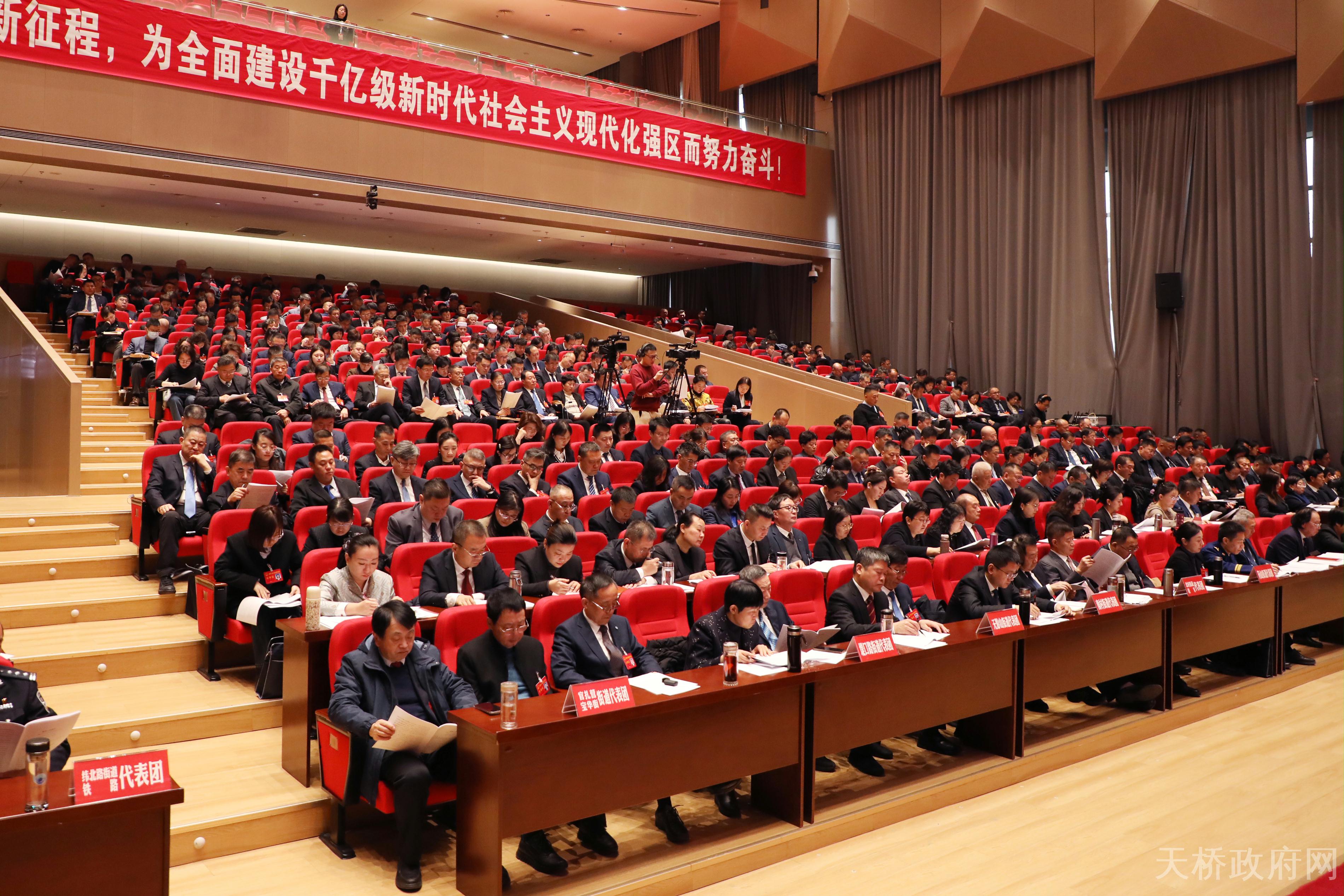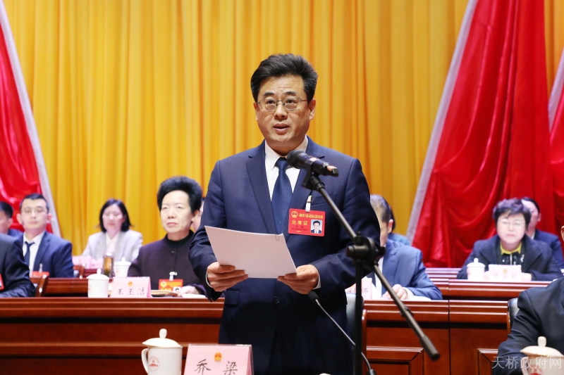 区人大常委会主任乔梁主持大会开幕式。上午9时,乔梁宣布:天桥区第十九届人民代表大会第六次会议开幕。全场起立,高唱中华人民共和国国歌。