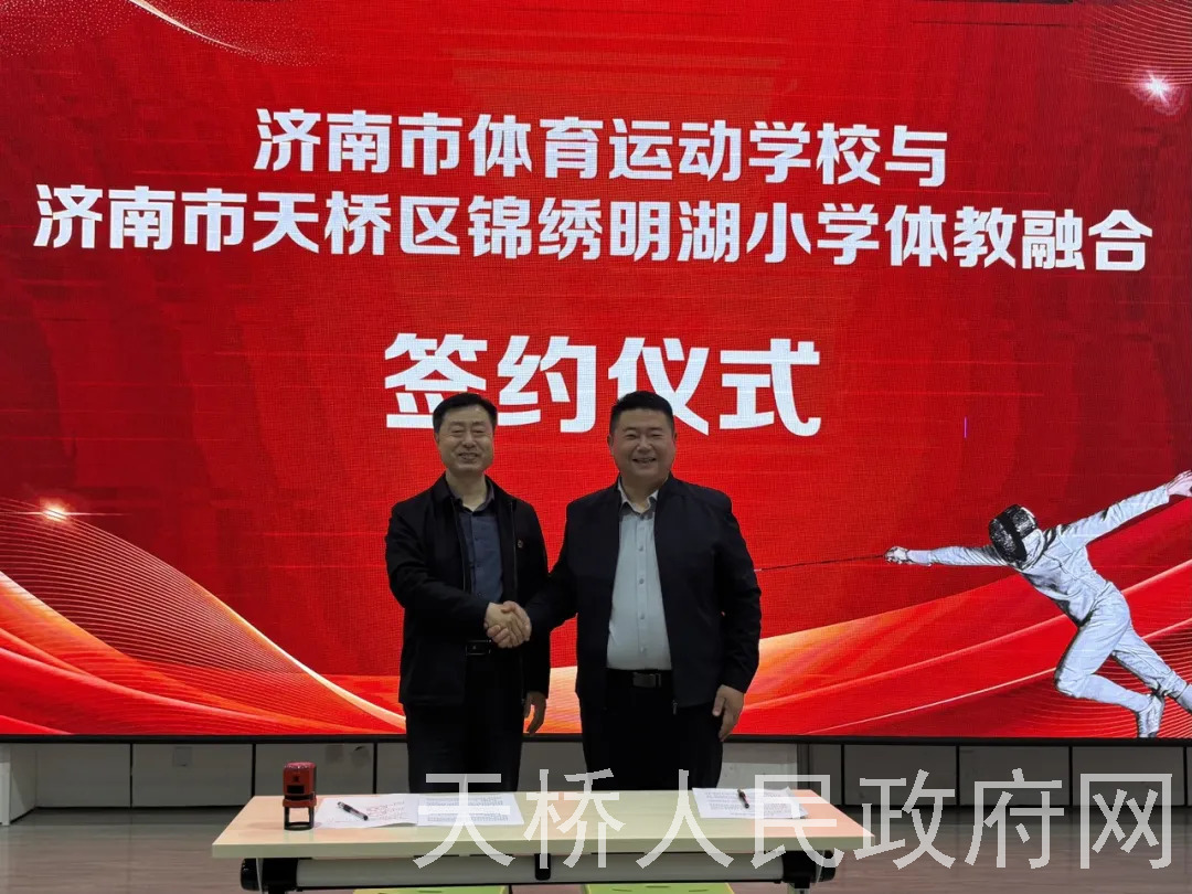 活动伊始,王建军对天桥体教融合工作给予充分肯定,并谈到,体教融合是新时代体育事业和教育事业协同发展的必然要求,希望以此次合作为契机,充分发挥专业体校的技术优势与学校的育人阵地功能,共同打造青少年击剑运动的“样板基地”,让更多孩子在家门口就能接受专业、系统的击剑训练。 亓连喜对市体育局、市体校长期以来给予天桥教育体育事业的支持表示感谢。她表示,此次体教融合签约与业训基地落地,是天桥区深化“健康第一”理念、推进体育育人、做强特色竞技项目的重要举措,将进一步畅通青少年体育人才培养通道,助力更多学子在运动中强健体魄、锤炼意志、成就梦想。 在全体与会人员的见证下,济南市体育运动学校与两所小学正式签署体教融合合作协议。随后,王建军与两校校长共同为“济南市青少年击剑业训基地”揭牌。 此次签约授牌,标志着天桥区在“体教融合”道路上迈出了坚实一步。今后,双方将在击剑课程开发、教练员培训、运动员选拔与输送、赛事活动组织等方面开展深度合作,推动专业体育资源进校园,助力青少年在体育锻炼中享受乐趣、增强体质、健全人格、锤炼意志,为济南市竞技体育可持续发展储备更多优秀后备人才。