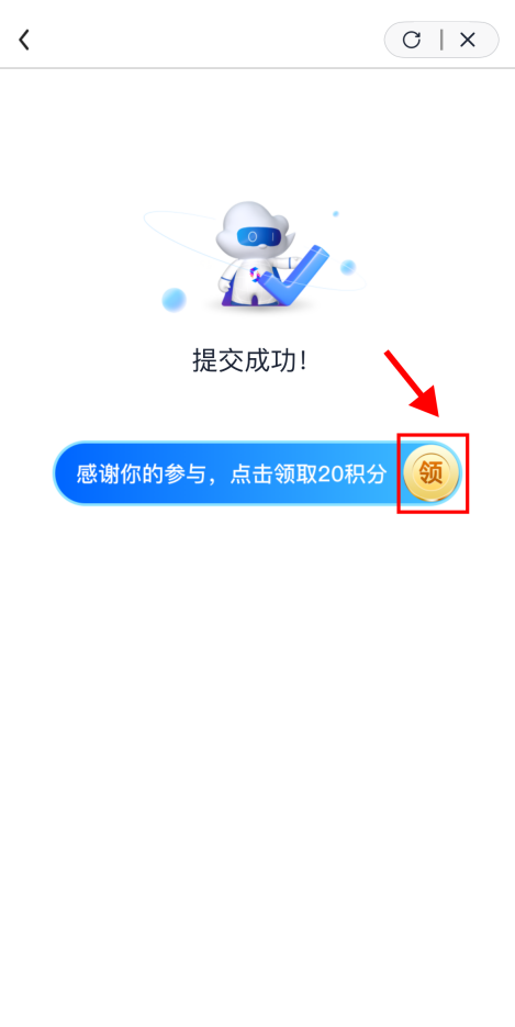 3.问卷填写完成,需选择所在地区,点击“提交”按钮。待提交成功跳转至领取积分页面时,点击“领”字,即可获取“爱山东”20积分。(每位用户共有10次参与机会,每次成功参与后将获得“爱山东”20积分。)