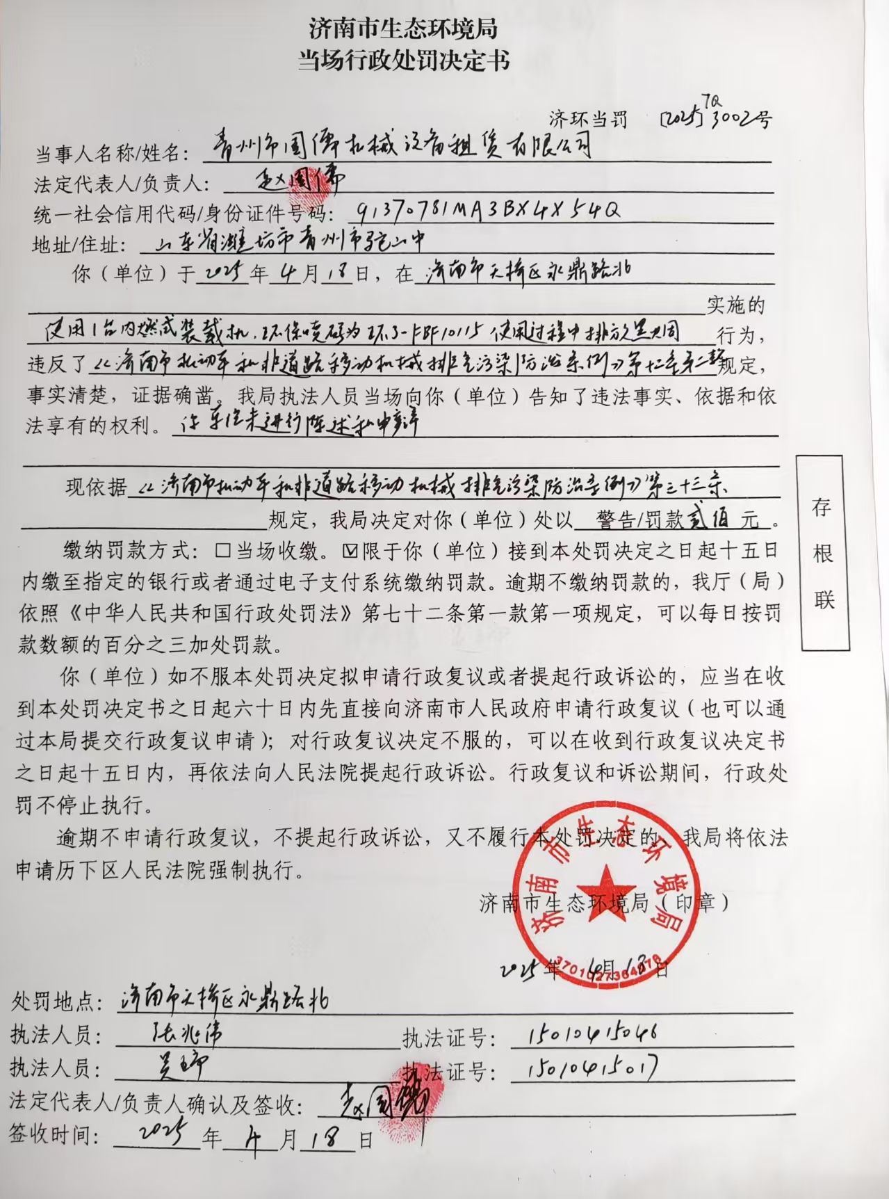 当场行政处罚决定书(青州市国儒机械设备租赁有限公司)