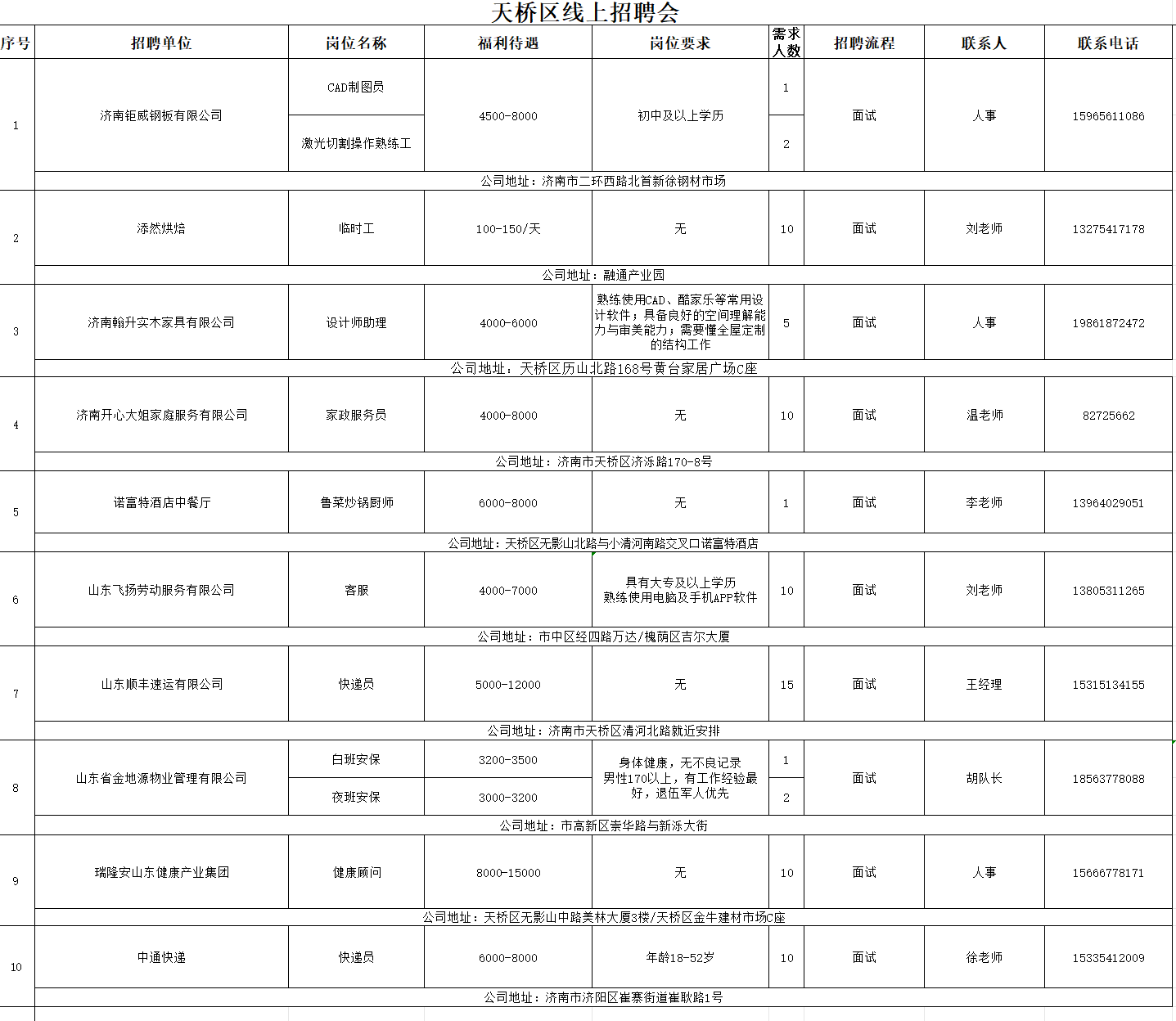 为保障企业尽快复工复产,求职者返岗,天桥区人社局举办“春风送岗促就业 真情相助暖民心”为主题的春风行动网络招聘会,此次招聘会共有10家企业,提供67个岗位。广大用工单位和求职者可通过以下渠道免费发布、获取招聘信息。